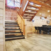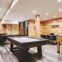 Inside, the gourmet kitchen is built to accommodate large groups, featuring dual ovens, stoves, dishwashers, and microwaves, so cooking is effortless. For entertainment, the lodge boasts a custom-designed home theater, where you can stream your favorite films in a true cinematic setting. The game room is packed with activities, including a pool table, air hockey, foosball, and poker table, ensuring hours of enjoyment.